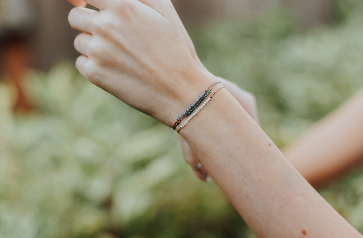 Tiny, freshwater pearl beads are hand knotted on a thin, durable nylon cord for this minimalist bracelet. Adjustable design with sterling silver sliding bead fits over the hand and fits most wrists. Bracelet comes packaged on a pretty card with stone meanings.