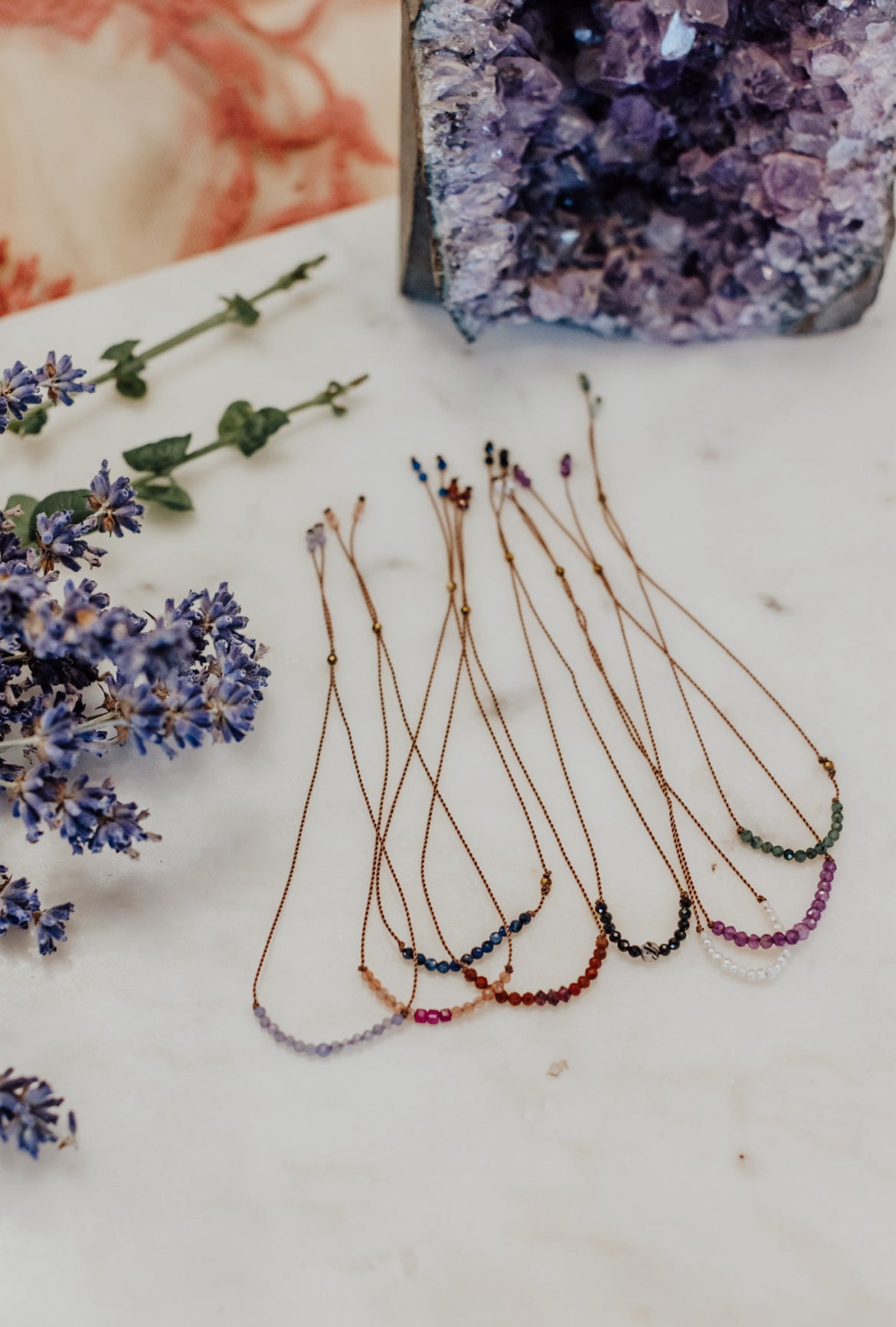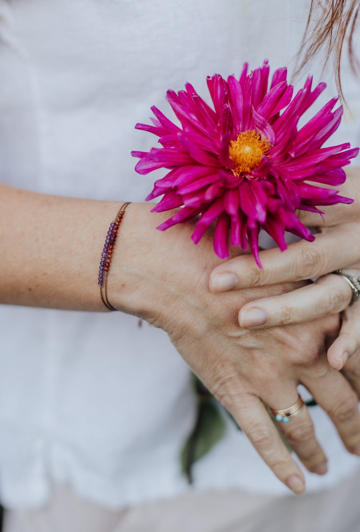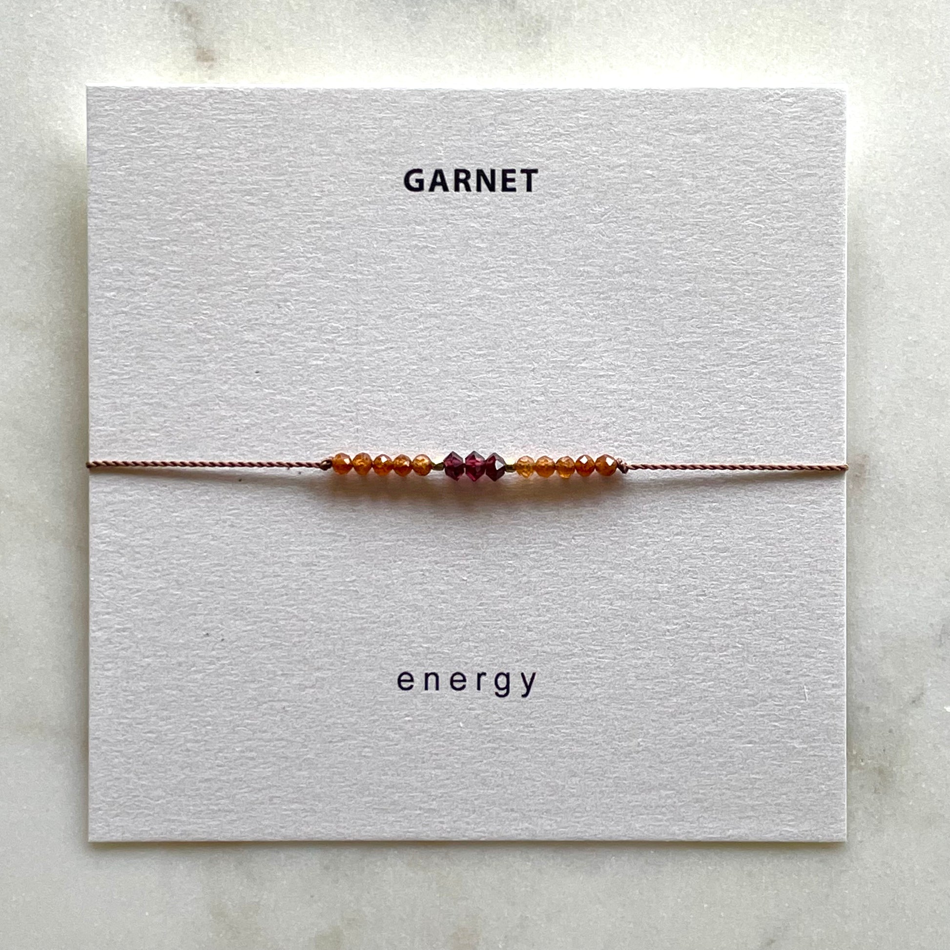 Energy bracelet featuring tiny faceted orange and red garnet gemstone beads accented by teeny tiny gold vermeil beads hand knotted on a thin, yet very durable nylon cord. Adjustable design fits over the hand and worn at any length. Bracelet comes on a pretty card with stone meaning ready for gifting or keeping.