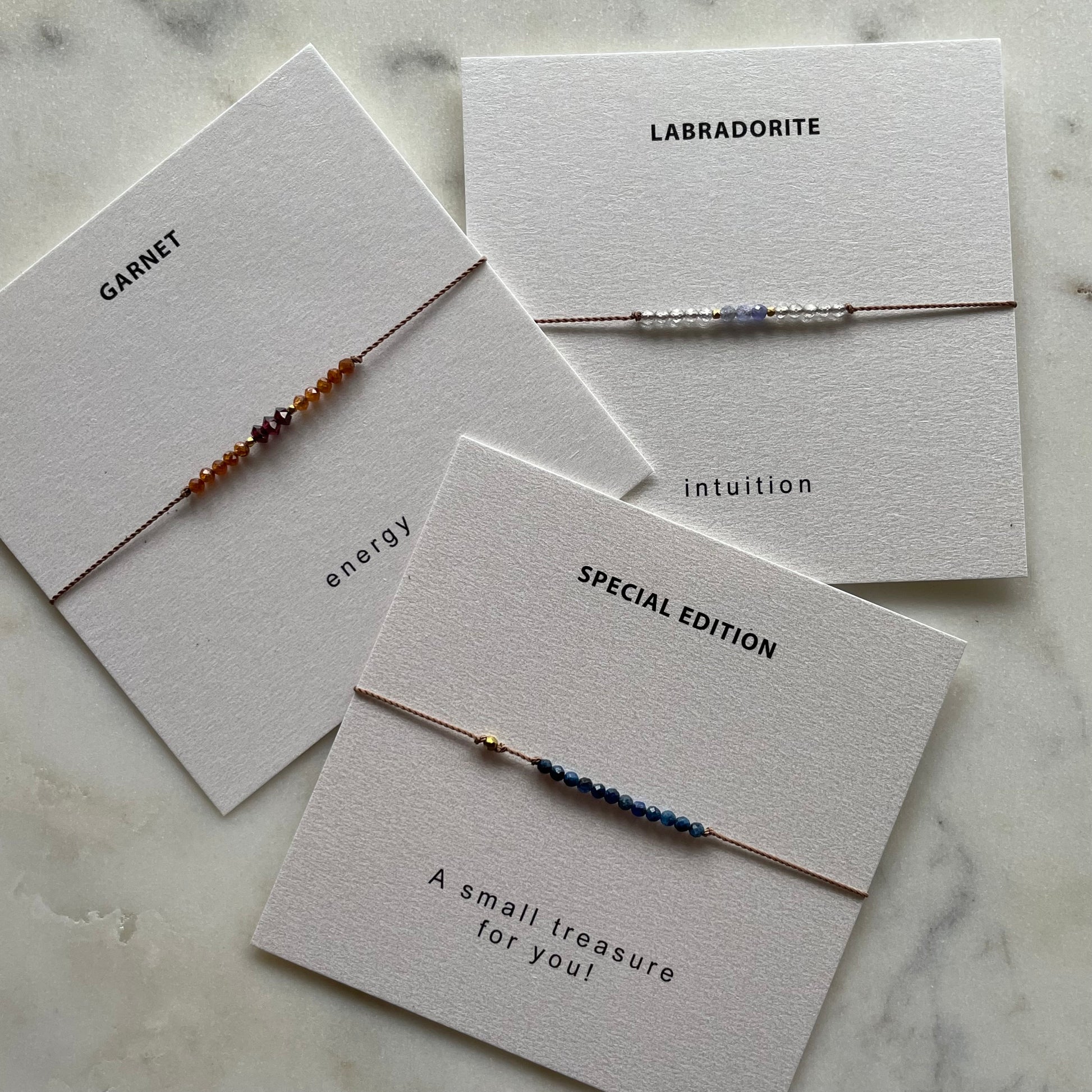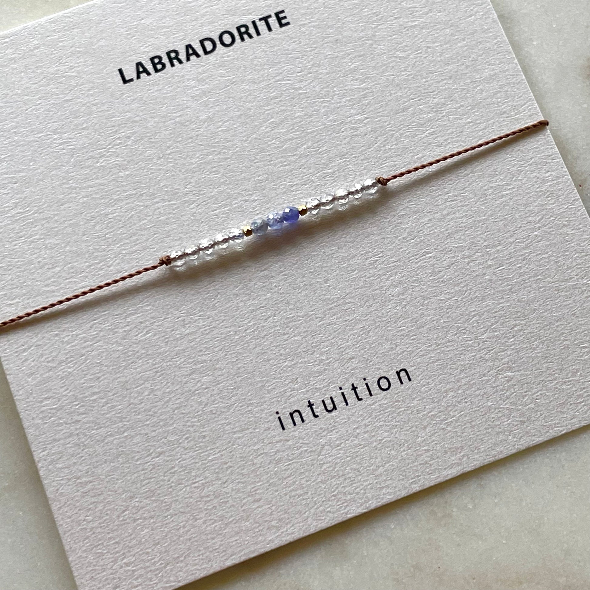 Tiny faceted labradorite and tanzanite gemstones are hand knotted along a thin, yet durable nylon cord for this minimalist bracelet. Adjustable design fits over the hand and can be worn at any length. Bracelet comes on a pretty card with stone meaning teady for gifting or keeping.