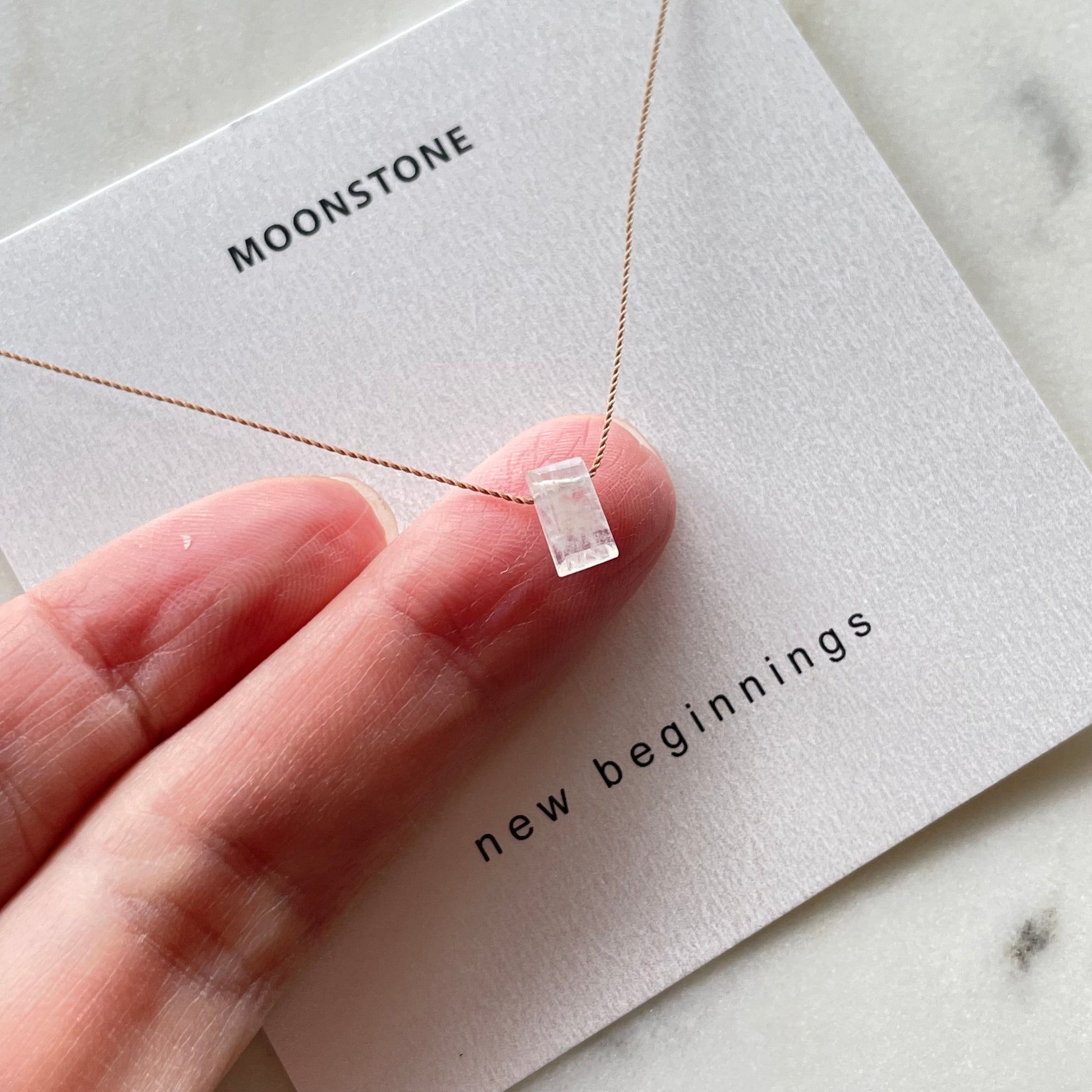 A new beginnings necklace featuring a small baguette shaped rainbow moonstone gemstone floating on a thin nylon cord. Finished with a sterling silver spirng ring clasp and made to 17". Necklace comes on a pretty card with stone meaning. Very lightweght and comfortable to wear.