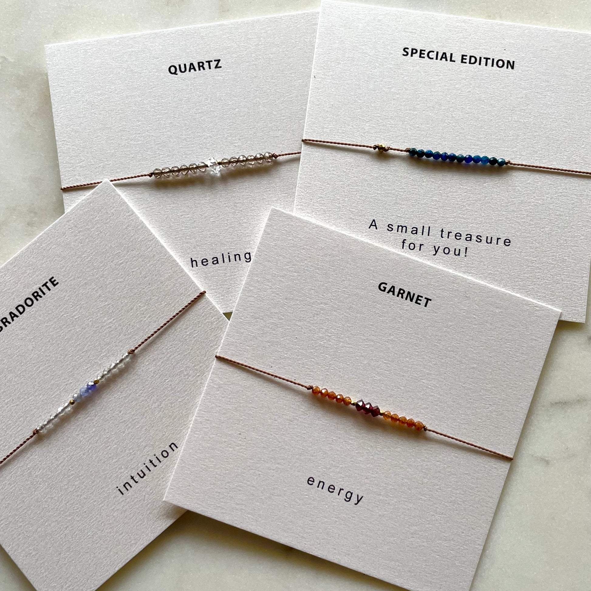 Healing bracelet featuring tiny, faceted smoky quartz, herkimer diamond, and gold vermeil beads hand knotted on a thin, yet very durable nylon cord. Adjustable design fits over the hand with a sliding bead. Bracelet comes on a pretty card with stone meaning ready for gifting or keeping.